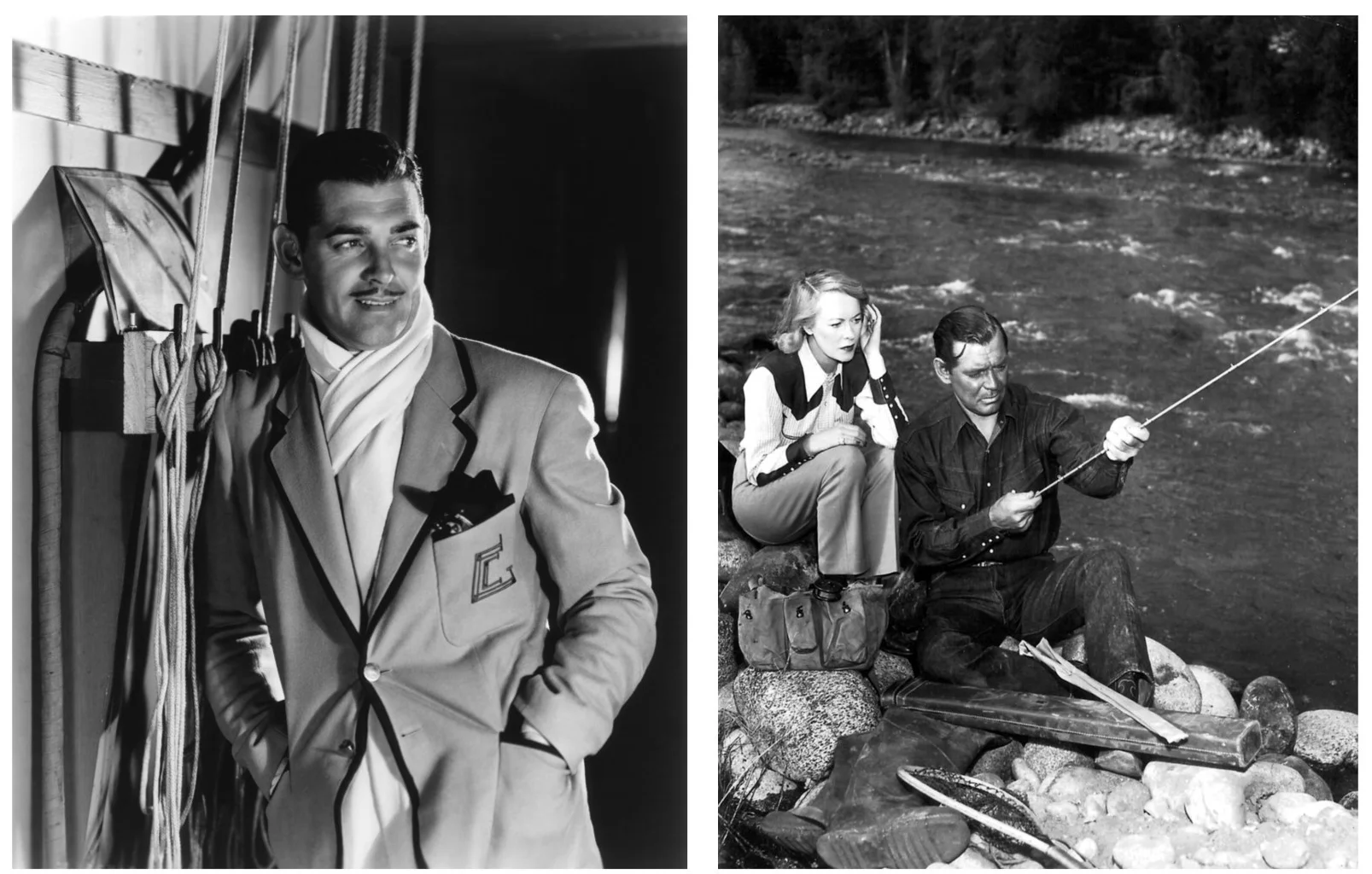 Studio publicity shot of Gable (left) and Gable and wife Sylvia fishing in Colorado during filming of Across the Wide Missouri (right).