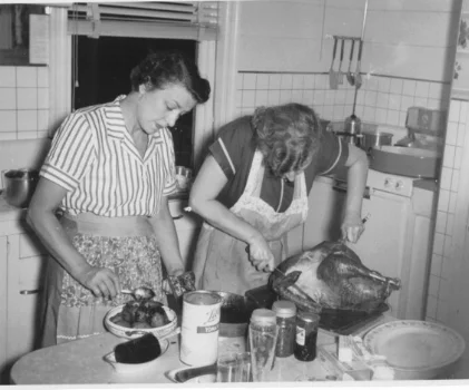 My great-aunt Ada and my grandmother, preparing the feast, 1952.