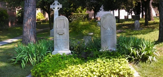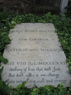 In Rome, I visited the Cimitero Inglesi where both John Keats and Percy Shelley are buried. The neighborhood of the cemetery is less than scenic, it even feels threatening, with graffiti and weeds overrunning the buildings and sidewalks. But the cemetery itself is within a high wall and walking through its gates makes clear the difference: the graveyard is terraced so the graves mount in front of you, rising up a small incline in a manicured garden of flowers and topiaried bushes and gravel walks and pruned trees…and, of course, an overflow of elaborate stones and vaults and statues. Shelley’s grave, at the nearly top tier of the incline is marked with a stone laid flat on the ground, surrounded by small boxwoods and ivy. On it is cut, “Cor Cordium” (Heart of Hearts). He is buried next to Trelawney, a friend who identified Shelley’s drowned body when it washed up on shore…to lie through eternity next to his friend: it portrays a Romantic life with passionate friendships.