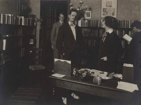 James Joyce with Sylvia Beach (center), John Rodker (left) and Cyprian Beach (right) at Shakespeare and Company, 1921 (Image courtesy of the Poetry Collection of the University Libraries, University at Buffalo, The State University of New York.)